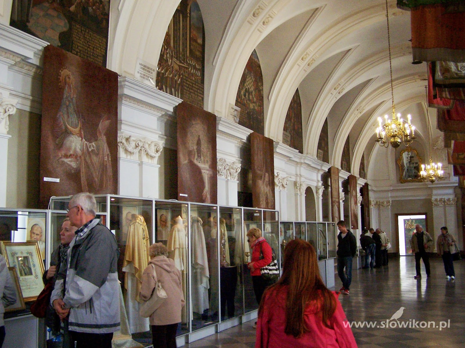 Gobeliny kiedyś były na stałe eksponowane w Sali Papieskiej. Po konserwacji zostały pokazane na wystawie. Muszę przyznać, że dobrze się prezentują w zabytkowej Sali Rycerskiej. Przedstawiają w artystycznej formie papieża Jana Pawła II m.in. na Jasnej Górze, w Lourdes, Boliwii, Irlandii, Austrii, Japonii… itd.